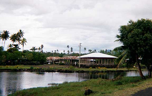 As we drive along the same road that we travelled by night when we arrived two days ago, we are surprised at how close most houses are to the water. Many have a "guest house" in the front, with the main house or fale (FAH-lay) behind that and then there's a backyard maybe 20 feet deep and the ocean.