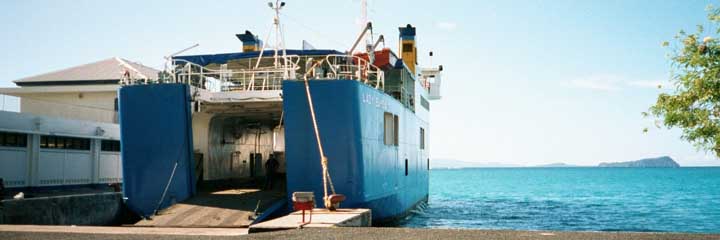 The empty ferry sitting at the dock on the island of Savaii, looking toward the island of Upolu. As the only inter-island transport, the ferry is always packed and they make the most of every square inch of the vehicle hold on the bottom deck. As we walk on board, I am amazed at how tightly they pack the cars and trucks. I watch in awe as they sandwich the cars so tightly together there is not even a hand's width between many of them.